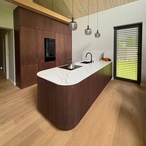 Jasna brzoza z widoczną strukturą warstw — naturalna, skandynawska estetyka. Front ze sklejki brzozowej pasuje do każdego wnętrza i łączy minimalizm z ciepłem naturalnego drewna.